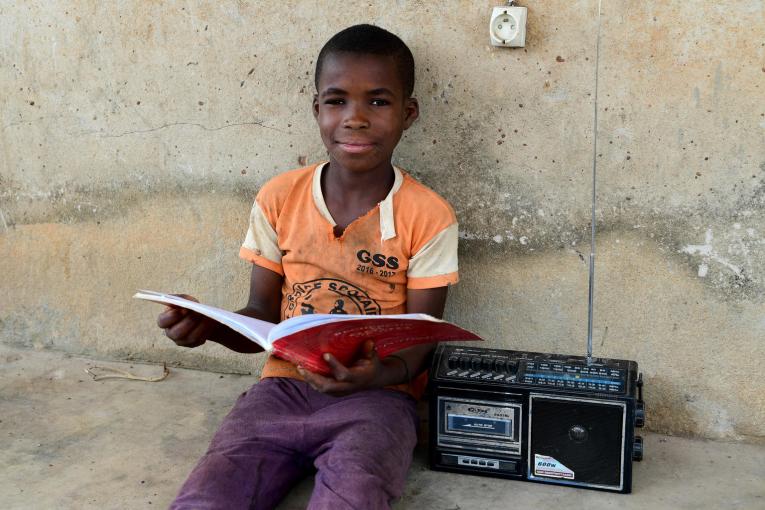 Em abril de 2020, um menino assiste a aulas pela rádio, na aldeia de Morovine, no norte da Costa do Marfim. Foto: UNICEF
